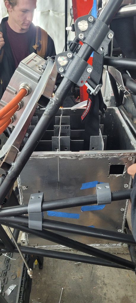 Now that I had a rough segment size, I could work on fitting the pack into the spaceframe. However, that proved incredibly challenging, as we as a team could not come to an immediate decision on what dimensions the casing should be to best accommodate for mounting, the center of gravity of the car (the pack weighed >10% of the car’s weight) and to avoid interfering with other subteams’ components.