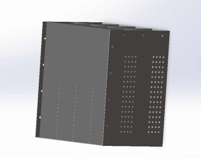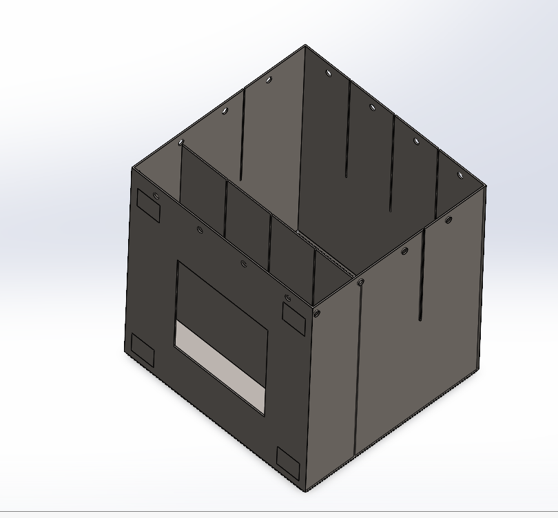 Initially, my solutions to the aforementioned considerations were to use 2mm thick steel 1020 sheets to create a rectangular casing with internal dividers to increase surface area to spread internal loading from the segments decelerating, as well as isolating the segments from each other. It was HEAVY (75kg) according to Solidworks, and my assembly process was to use tabbed slots that would be slid together.