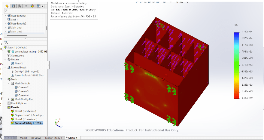 FSAE rules stated the pack had to withstand 40G lateral and longitudinal deceleration, and 20G vertical deceleration (simulating a crash and roll) in order to sufficiently protect the driver from the batteries combusting under impact.