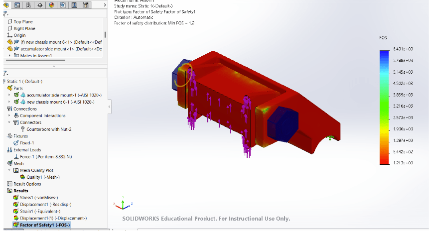 After adjusting the dimensions to increase thickness (3.5mm wall) on Solidworks, Aluminium proved to be 20 KG lighter than steel for an equivalent (slightly lower) strength rating, though still within our restrictions. Aluminium is more ductile than steel is, and has a lower yeild strength, but has a far higher strength-to-weight ratio than steel, thus proving itself valuable for our purposes. Re-running the FEA gave us a FOS of 5.5, which was perfectly adequate.