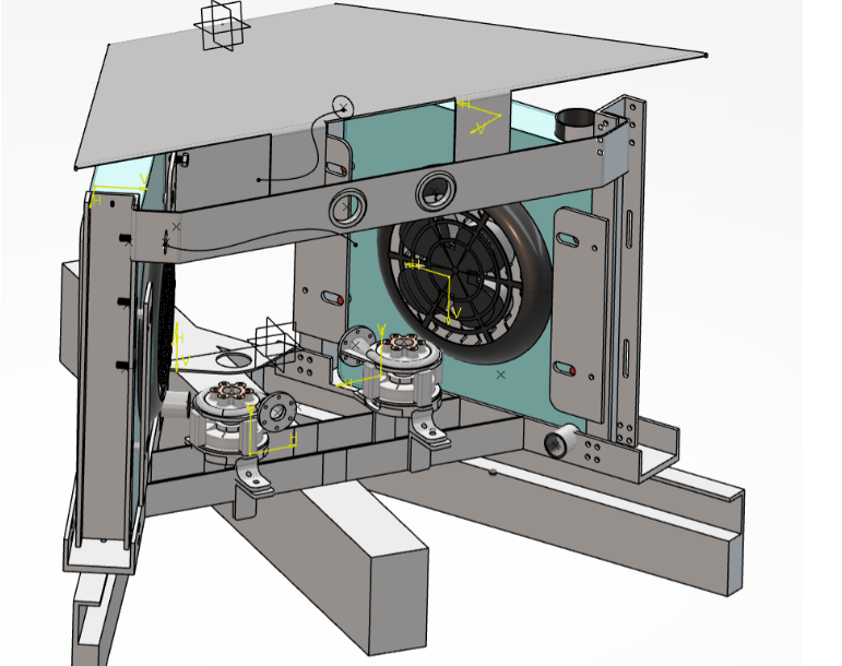 I chose radiators and pumps to run coolant through two seperate loops, cooling the batteries and the high voltage electronics. I then designed the frame to hold all the components together using Catia, which was a lot of sheet metal modeling.